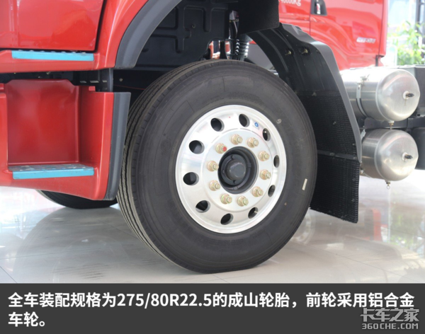 全车装配规格为275/80R22.5的成山轮胎,前轮采用铝合金轮辋,相比传统的钢制轮辋它的自重更轻,耐腐蚀性和散热性也更好。另外,车辆的前轮可以选装盘式制动。