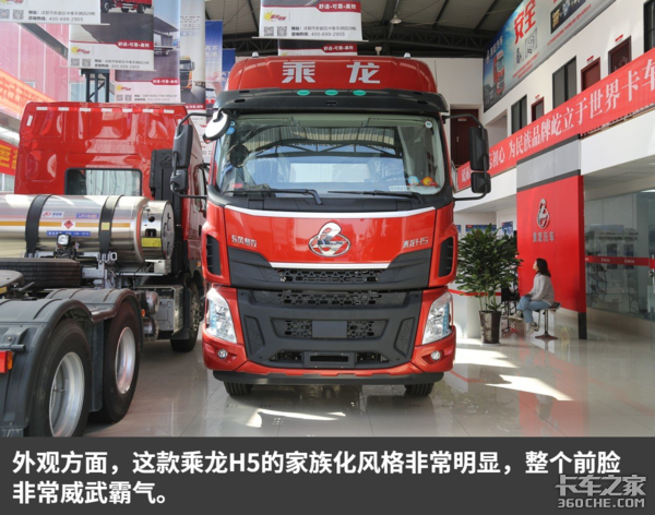 外观方面,这款乘龙H5的家族化风格非常明显,大幅黑色的中网搭配造型犀利的大灯组和两侧导流槽,将整个前脸烘托得威武霸气。