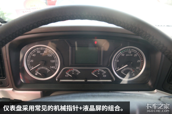仪表盘采用常见的指针式仪表搭配液晶屏的组合。从左到右分别是车辆时速表、油量表、气压表、发动机转速表。