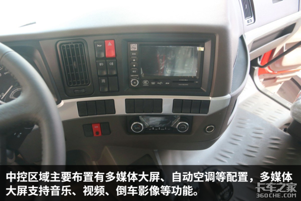 中控台在布置上偏向主驾驶一侧,这样卡友们开车时能更加便捷地操控中控台。中控区域内主要布置有多媒体大屏、空调等配置,多媒体大屏支持音乐、视频、倒车影像等功能,可玩性比较不错,同时非常方便卡友倒车。