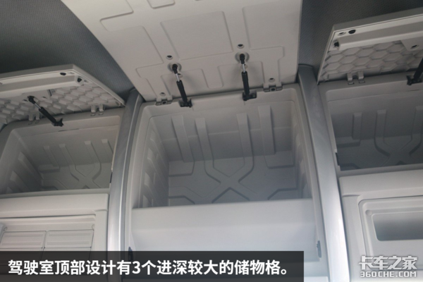 驾驶室内的储物空间总体来说比较丰富,除了副驾驶前面的手套箱等地方外,车顶上方设计有3个进深较大的储物格,足够容纳下两位驾驶员的日常生活用品。
