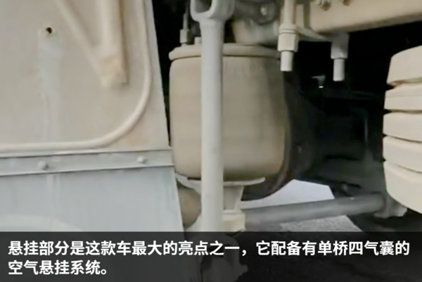 悬挂部分是这款车最大的亮点之一,它配备有单桥四气囊的空气悬挂系统,运输高附加值货物时可以对货物起到非常好的保护作用,同时行车舒适性也会大大提高。