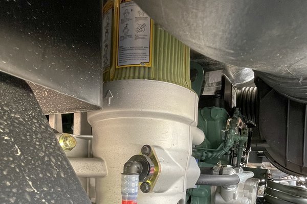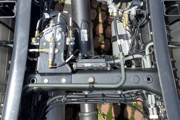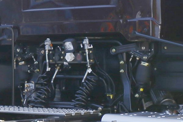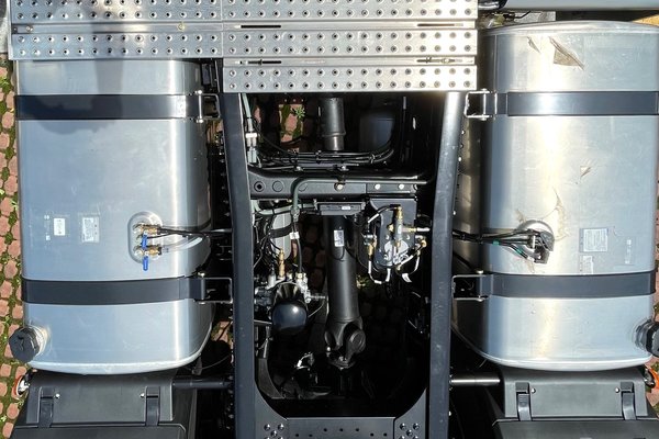 通过图片我们能够看出,在车辆的左右两侧各布置了一款铝合金油箱,初步推测整体的容量应该在1000升左右,对于满足车辆续航没有任何问题。