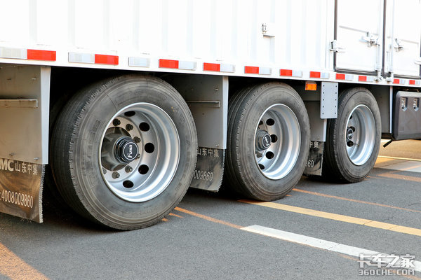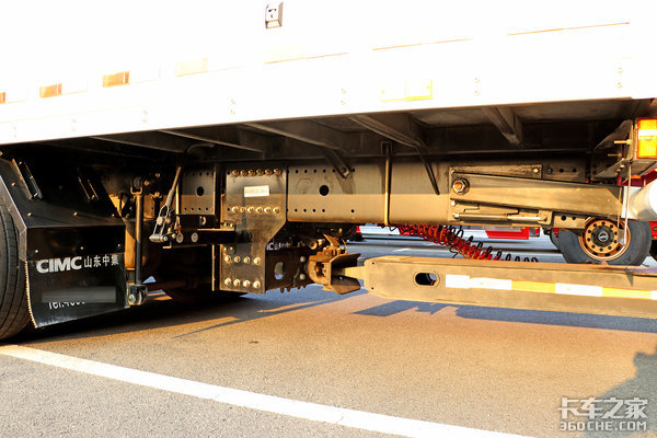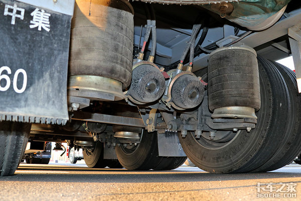 为了能够更好的应对快递运输的甩挂、甩箱运输,除主车后桥匹配气囊悬架外,挂车所有车桥同样皆是匹配了气囊悬架,并且挂车的车桥还是富华桥,整体都是由中集厂家制作的。