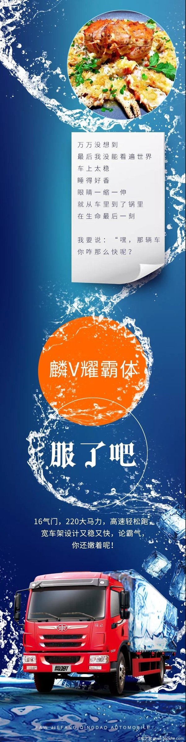 当前位置: 卡车之家 >卡车经销商 > 南阳市腾瑞汽车销售 > 促销新闻 > 【解放轻卡】留鲜不断链,麟V耀霸体制霸帝王蟹
