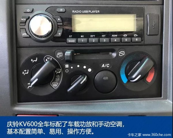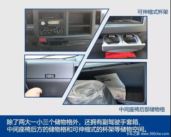 庆铃KV600的驾驶室内部设计了非常多的储物空间,除了中控台的两大一小三个储物格外,还拥有诸多充满人性化设计的储物格,如:副驾驶手套箱、中间座椅后方的储物格和可伸缩式的杯架等储物空间,满足驾乘人员行车时的日常所需。