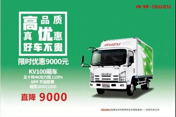 2019年,正值庆铃、五十铃合资合作35周年。庆铃汽车携旗下100P/KV100/KV600等明星轻卡车型展开了以“高品质、真优惠、好车不贵”为主题的促销活动。其中,庆铃五十铃KV100厢式车以9000元的购车特惠面向消费者,这款高端厢式车优惠价为10.98万元起。为想要拥有一辆蓝牌合规轻卡的用户提供绝佳的购车良机。