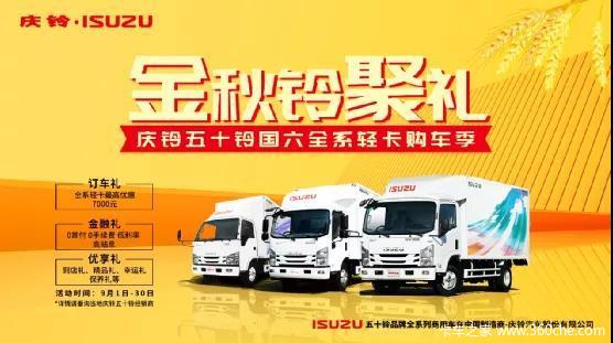 面对国六这场严苛的“考试”,庆铃五十铃早已准备好了解决方案,自9月1日起,在全国范围内开启“金秋铃聚礼 庆铃五十铃国六全系轻卡购车季”活动。不仅有放心开、放心用的国六全系好轻卡,更有令人心动的最高7000元优惠及多重礼遇回馈新老用户,在金九银十旺季到来之前,助力更多用户轻松选购心仪好车。