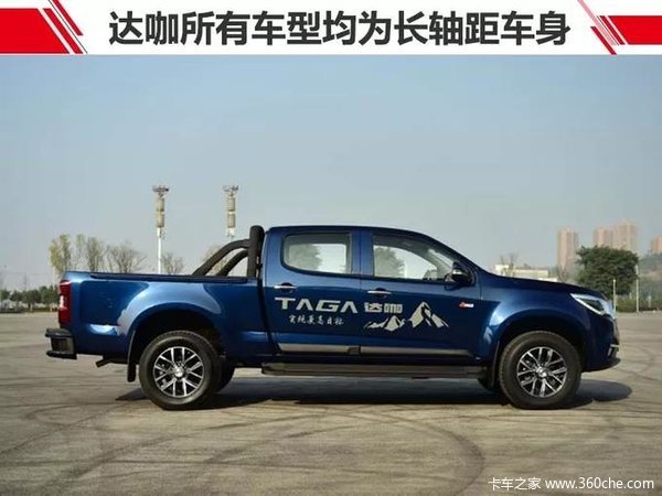 达咖皮卡均为长轴距长货箱车型,车身尺寸达5660*1885*1825mm,货箱尺寸为1800*1540*480mm,轴距长达3406mm。目前该车共有5款车型在售,售价区间为9.98万—13.18万元。