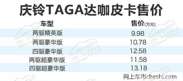 如果把同价位的产品进行比对,我们可以看到,庆铃达咖的配置非常丰富,属于高配置低价格的高性价比产品。相对而言,我比较推荐这款车的高配车型。