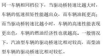 驱动桥速比即汽车驱动桥中主减速器的齿轮传动比,等于传动轴的旋转角速度与车桥半轴的旋转角速度之比,也等于他们的转速之比。驱动桥速比对于车辆的动力性能和燃油经济性有着较大的影响,可以起到减速增矩的作用。以驱动桥速比是4.1的主减速器为例,当传动轴转动4.1周时,车桥半轴才旋转1周。