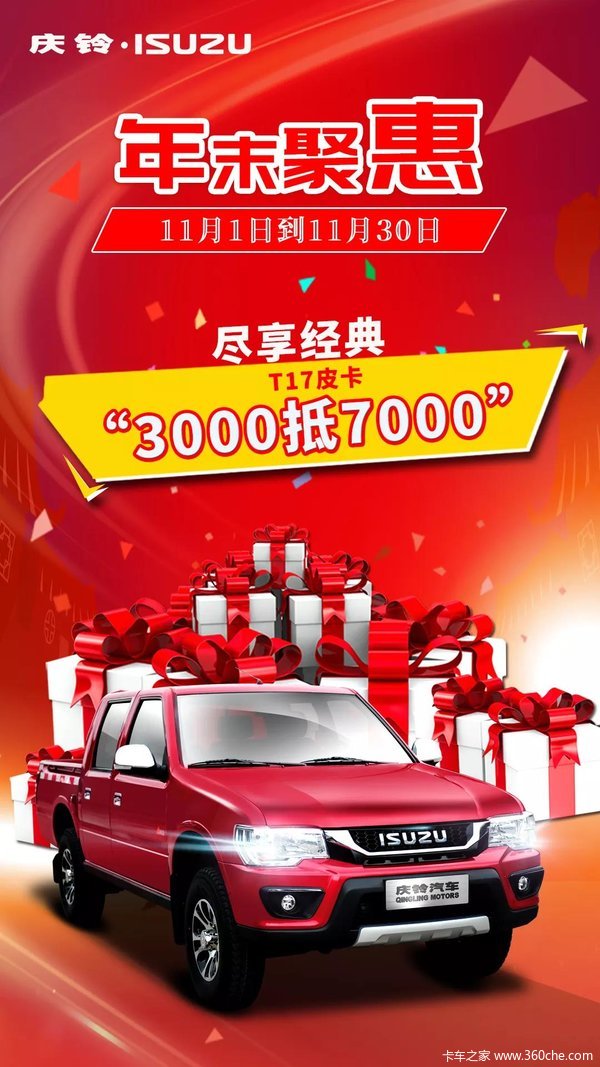 成功,永远属于那些善于改变的人。就像庆铃汽车,20多年的皮卡制造经验并没有让其墨守成规,从引进五十铃940皮卡到TF140皮卡再到升级版T17皮卡的问世,庆铃五十铃皮卡一直在随着社会的改变而改变,唯一没变的是让用户用得起、用得舒心、用的放心的宗旨,成为了皮卡市场最受信赖的产品之一。为了让更多用户享受合资高品质皮卡带来的超值体验,庆铃汽车特在年末到来之际开启以“年末钜惠·尽享经典”为主题的购车优惠活动。现在购买T17全系皮卡(包含加长版)即可享受“交3000元抵7000元”的现金优惠,售价从9.38万元起,促销活动将从11月1日延续至11月30日。