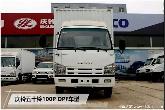 庆铃五十铃100P DPF车型搭载3.0L排量的五十铃4KH1发动机,采用高压共轨技术,1800bar燃油喷射压力,雾化效果好,燃油经济性更高,最大马力130ps,最大扭矩290N·m。发动机噪音低,低速提速性能优异。