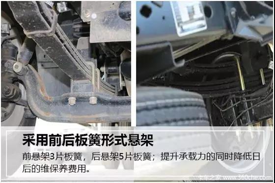 在日常运输中装的多、跑的快就意味着卡友的收入多。而庆铃五十铃100PDPF车型采用前后板簧形式悬架,前悬架3片板簧,后悬架5片板簧。这样的板簧悬架设计既提高了整车承载能力也降低了日常使用的维护保养费用。