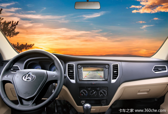 首先,舒适内饰,物流驾乘路上更轻松。轿车化的内饰设计,驾驶室连同座椅均采用分色设计,整体协调美观。三幅式运动方向盘、双门电动车窗、菱形镀铬空调出风口、炮筒式仪表盘、更加接近乘用车的中控台造型。中控台7寸彩色大屏,MP5多媒体系统兼顾收音、USB插拨、视频及导航功能;高配车型带倒车摄像头,倒车安全性进一步提高;空调出风口、点烟器、烟灰缸、储物箱,各种人性化设计已经渗透到细节里。