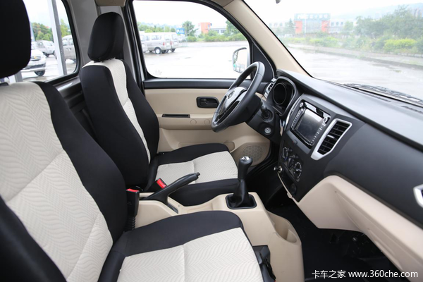 轿车化的内饰设计,驾驶室连同座椅均采用分色设计,整体协调美观。三幅式运动方向盘、双门电动车窗、菱形镀铬空调出风口、炮筒式仪表盘、更加接近乘用车的中控台造型。