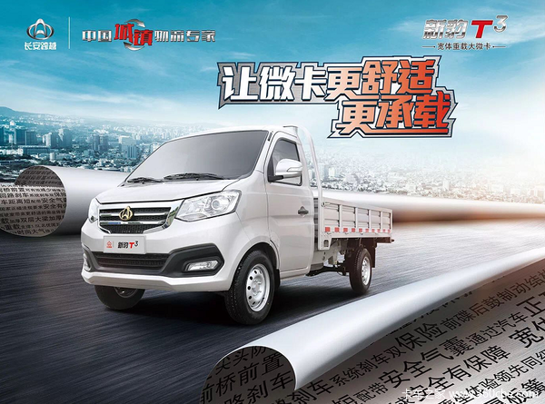 长安跨越新豹T3是长安跨越最新研发的一款承载式微卡车型,定位宽体重载大微卡,填补了长跨在承载式微卡细分市场的产品空白。其产品优势主要体现在安全、宽体、重载、舒适这四个方面。