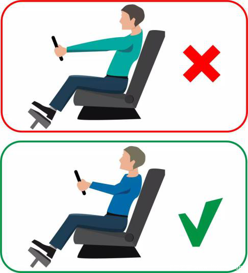 座椅的基本位置切记不能太靠前,"趴"在方向盘上开车;也不能太靠后,"躺"在座椅里开车。这都是不安全的。太靠前容易在发生事故时,前方向盘气囊弹开时受到伤害;太靠后则容易阻挡视线,而且无法准确操控方向盘。