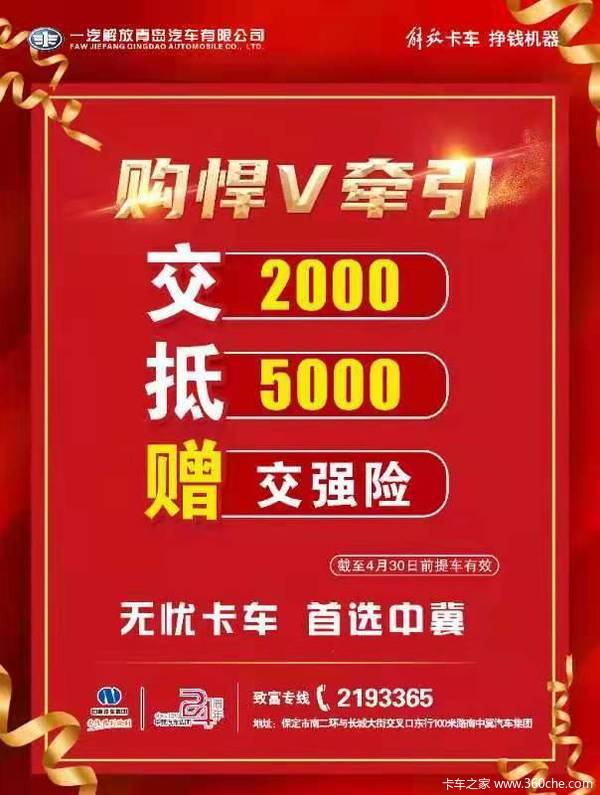 当前位置: 卡车之家 >卡车经销商 > 保定铭晔汽车销售(青岛解放) > 促销新闻 > 悍V牵引,让利大促,交2000抵5000!