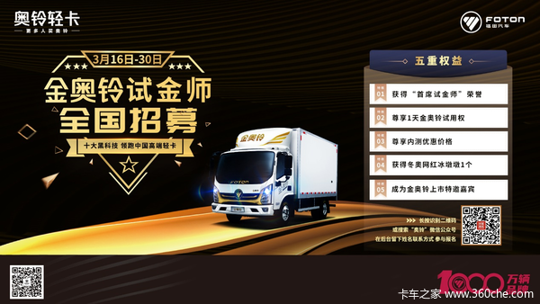 好消息是,据内部人员透露,金奥铃有望在今年4月份正式上市。同时,为了进一步验证金奥铃的黄金品质,奥铃发布招募令,3月16日-30日,面向全国招募5位“试金师”,不仅能够在金奥铃上市前近距离感受金奥铃“十大黑科技”的独到魅力,并且可以专享五重权益。