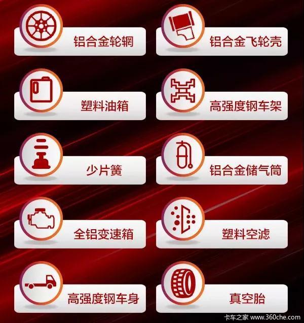 非承载部位:在非承载部位和不影响车辆安全的部位,也采用了新技术、新材料,比如:前少片簧设计,相比多片簧重量减少约50%,油箱、储气筒和后防护等配件在材质选择上使用的也是质量轻、使用寿命长的铝合金材质,从多方面减轻了车身的自重,可谓是“轻”上加“轻”;搭配的真空胎、塑料油箱能够让整车减重112公斤,可降低油耗3%。