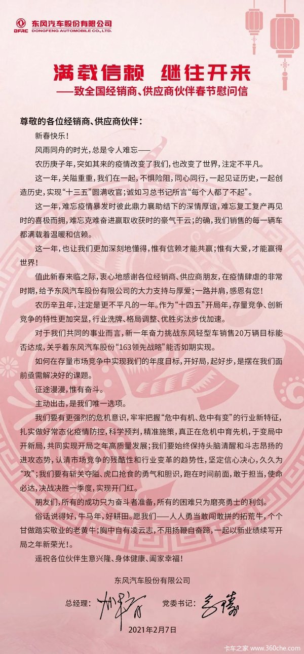 当前位置: 卡车之家 >卡车经销商 > 石家庄玛泰汽车销售(凯普特) > 促销新闻 > 满载信赖,继往开来!——致全国经销商、供应商伙伴春节慰问信