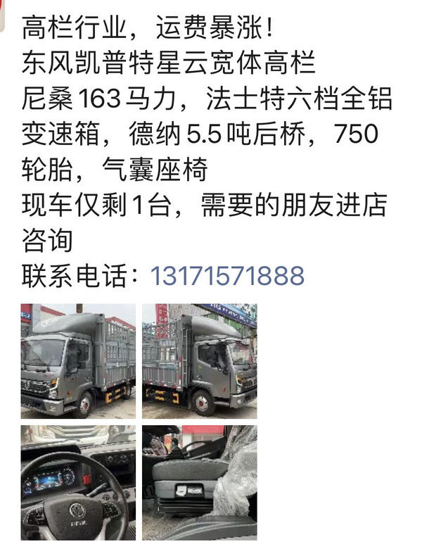 当前位置: 卡车之家 >卡车经销商 > 石家庄玛泰汽车销售(凯普特) > 促销新闻 > 东风凯普特星云宽体高栏,现车仅剩1台,需要的朋友抓紧联系