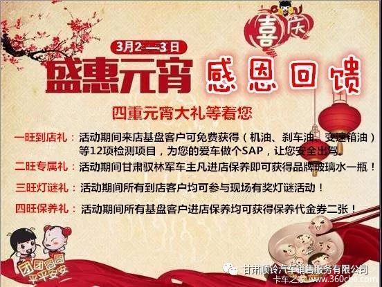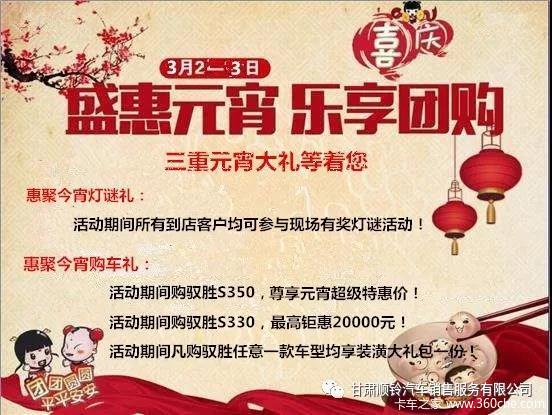 当前位置: 卡车之家 >卡车经销商 > 甘肃顺铃汽车销售服务 > 促销新闻 > 元宵圆车梦 江铃驭胜元宵盛惠等你来闹