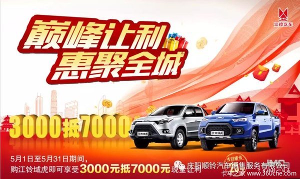 把握机遇乘风行!素有皮卡界风向标之称的江铃域虎,盛夏之际针对全系车型优惠让利!即日起至5月31日,购买江铃域虎即可享受3000元抵7000元现金让利!