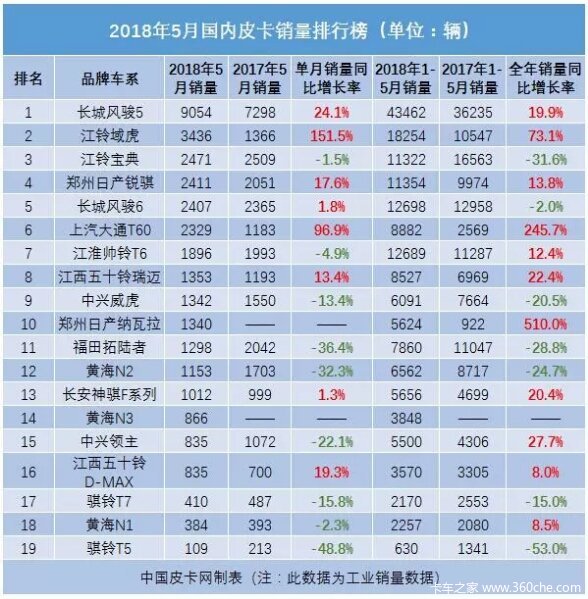 5月份中国皮卡销量喜报:江铃域虎位列亚军,江铃宝典位列季军,江铃皮卡合资技术30多年,这就是最好的实力见证!可以给客户看此表,帮助大家说服客户促单!