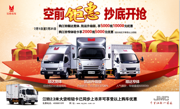 7月1日至7月31日购买江铃顺达宽体,凯运升级版,可享5000抵10000元的优惠政策;购江铃窄体轻卡可享2000抵5000元的优惠政策。