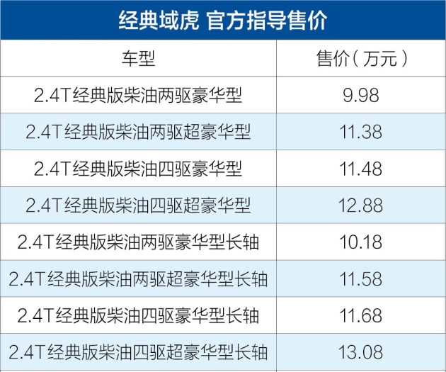 动力方面,经典域虎全系采用2.4T柴油发动机+5MT的动力搭配,发动机最大功率为103kW,最大扭矩为310牛·米,传动系统统匹配的均为5挡手动变速箱。