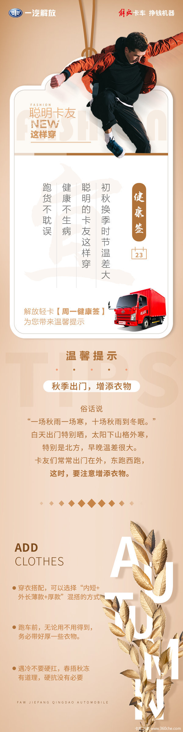 当前位置: 卡车之家 >卡车经销商 > 保定市陆兴汽车 > 促销新闻 > 一汽解放 提醒解放卡友一场秋雨一场寒 及时添加衣物
