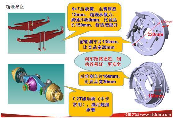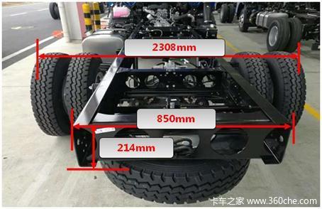 采用850mm宽车架开档,后桥轮距达到1785(轮廓达到2308),满足货箱加宽到2300/2420/2450(极限尺寸)且行驶稳定性好。