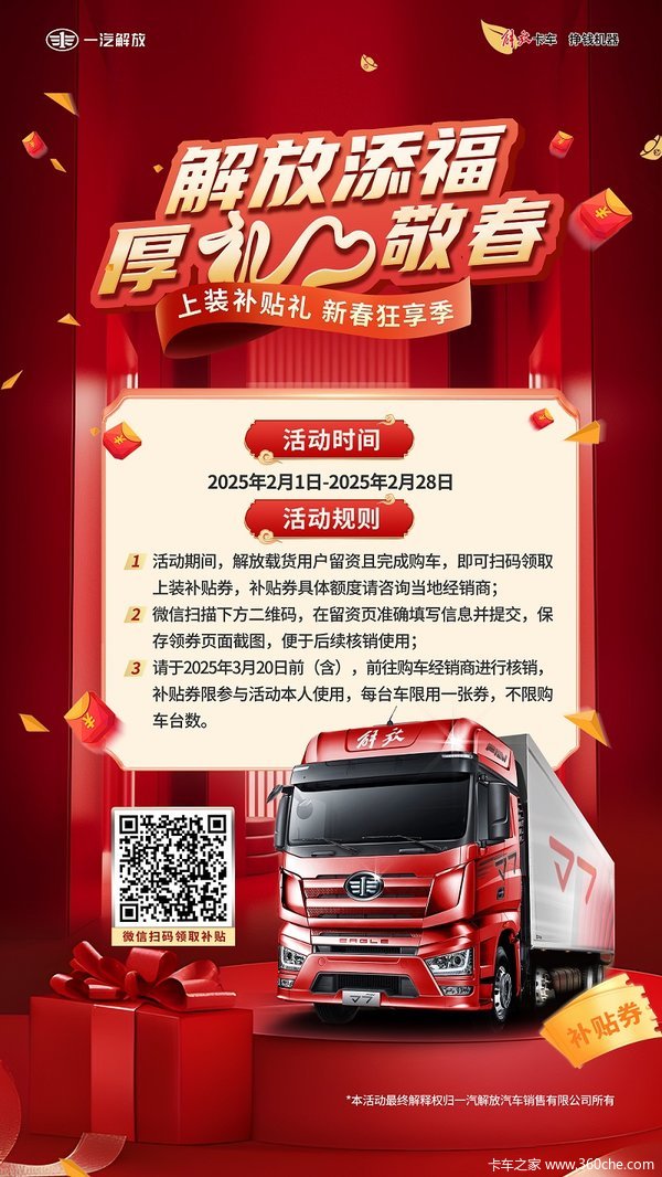 当前位置: 卡车之家 >卡车经销商 > 西安宝信达汽车 > 促销新闻 > 解放添福厚礼敬春-解放新春载货上装有补贴