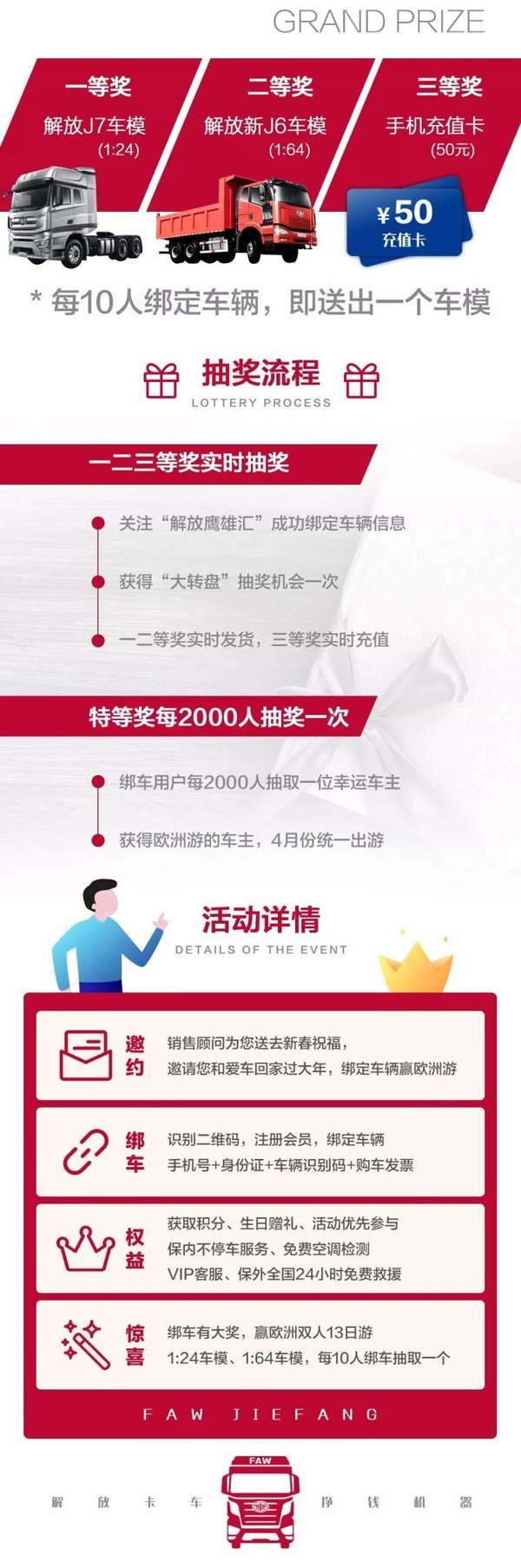 没错,解放搞活动,就是这么大手笔。新春祝福,感恩用户,你绑车,我送礼。成为解放会员,成功绑定车辆,更多尊属权益、超级礼遇等着你。“解放鹰雄汇”卡友俱乐部,加入我们,卡友也能享受豪车车主的待遇!