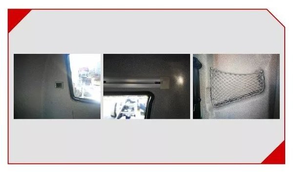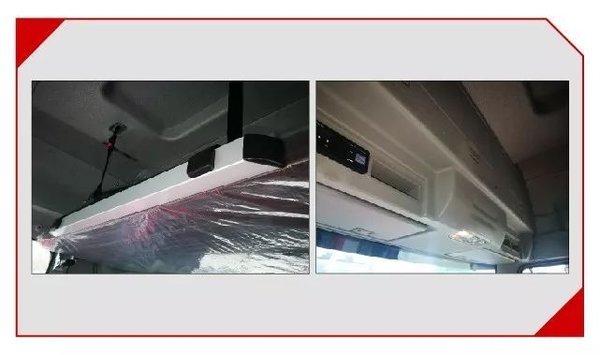 选装高顶双卧铺驾驶室,内部底板至顶部高度达2055mm;650mm宽双卧铺,方便两人休息;高架箱,加大驾驶室内储物空间。