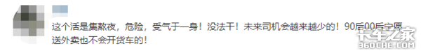 除此之外,有一位卡友的留言也说出了未来的担忧“未来两年还会更加缺半挂司机”。这位卡友给出的理由是,前期的计划生育很大程度上减缓了新生儿的出生,折就导致现在社会老龄化状况明显。虽然现在有关部门建议放开三胎,但是现在培养一个孩子的成本太高,许多夫妻连生二胎的想法都没有,更别说三胎。
