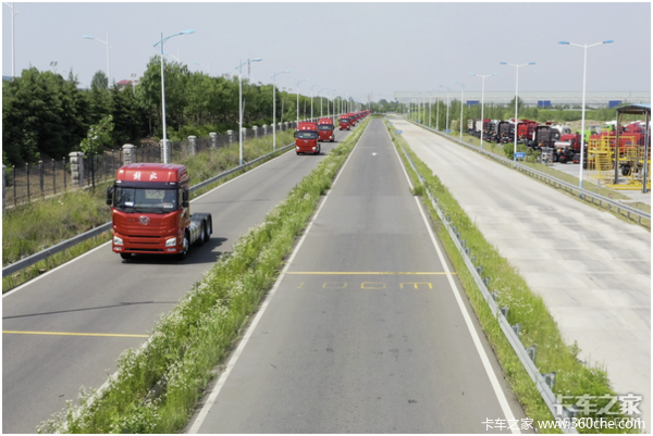 今天供卡友们试驾的这条跑道,全长约3.5公里,拥有扭曲路、颠簸路、直线加速路等多种路面,能对车辆的加速、转向、刹车等各项性能进行全方位的检验。这条跑道平时是用来检测新车质量的,每一台解放青汽生产的卡车,驶下生产线后都要在这条试车跑道长跑上几圈,确认没问题才能出厂交给用户。