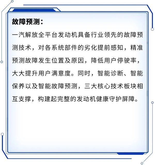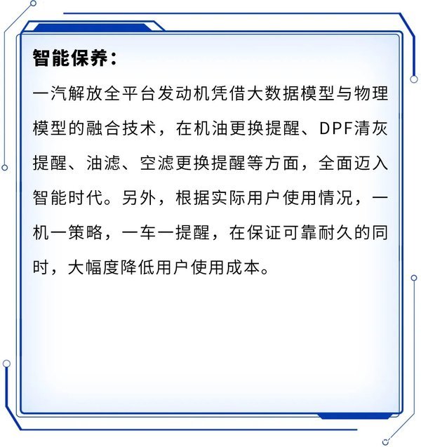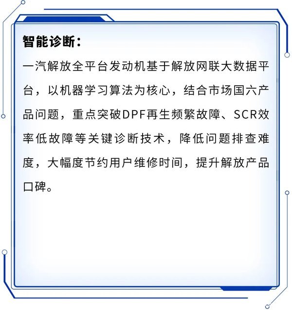 目前,该技术已经应用于解放国六全系产品,在发动机健康管理、智能维护保养领域,以大数据算法为技术内核,以减少用户进站维修次数,提升用户满意度为宗旨,打造三大核心技术板块,实现解放动力产品的价值提升。