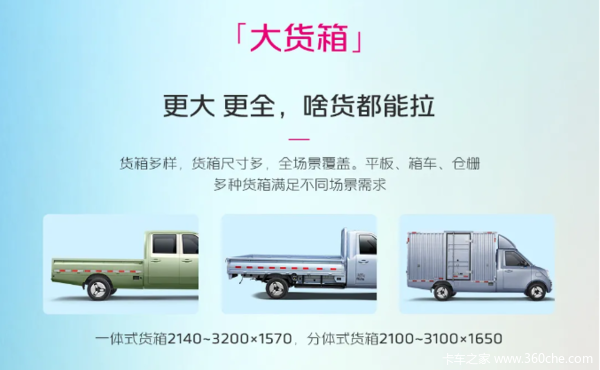 不仅跑得快,而且单趟拉得多,祥菱Q有着宽敞的载货空间和强大的承载能力。其单排车型最大适配3200mm货箱,双排车型最长适配2500mm货箱,货厢宽度达1570mm,并提供了栏板、仓栅、厢式、翼展式等多种上装,超长的货厢尺寸及超大的载货空间,为用户大体积货物运输带来极大便利。同时,祥菱Q采用承载式车身结构,配备前麦弗逊式后整体桥式悬架,其中后桥提供3片、5片板簧悬架设计,内部还带有多根加强型横梁,使得车辆在保证稳定性的同时,具备出色的承载能力。