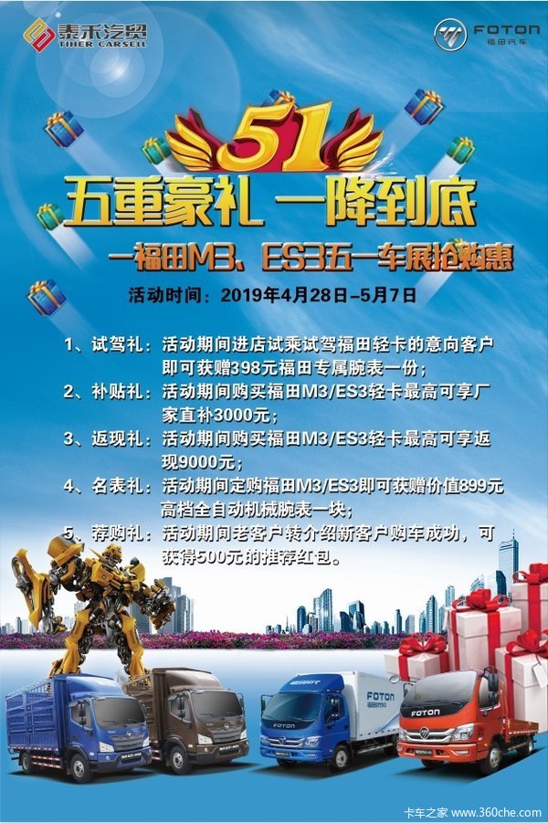 当前位置: 卡车之家 >卡车经销商 > 济宁泰禾汽车销售服务(福田瑞沃) > 促销新闻 > 福田微车大放价 五重豪礼惠全城-福田微车五一车展抢购惠