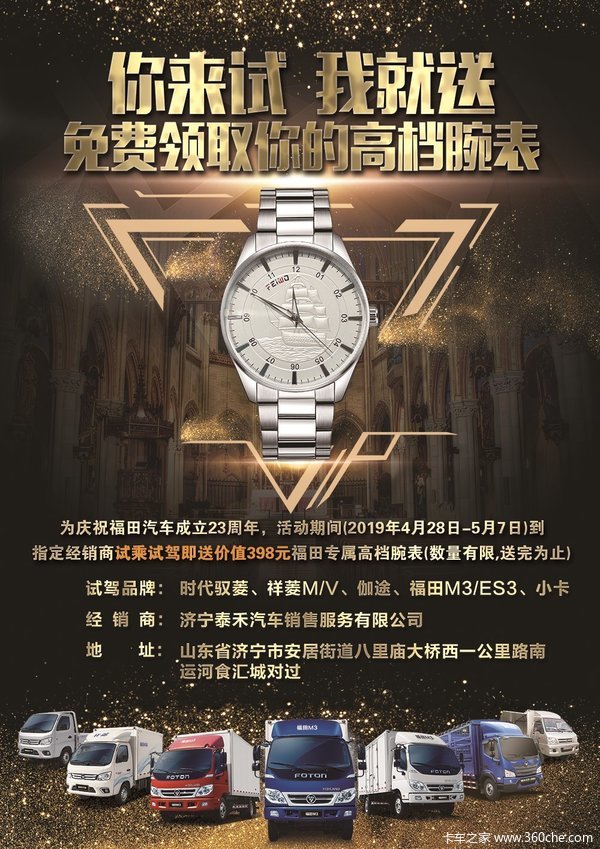 福田卡车大放价,五重豪礼惠全城!活动第六天,来就送,买即赠,购就返。试驾还送价值398元高档腕表一块 ,给福田点个赞,买福田高档微卡,就到(济宁市任城区八里庙大桥西1公里路南济宁泰禾汽贸)