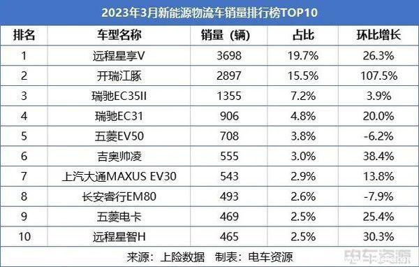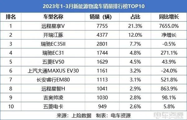 具体来看,远程星享V排名第一,是一季度新能源物流车市场唯一一款销量超7000辆的车型,总销量达7755辆,市占比为 21.3%,同比增长7655%。