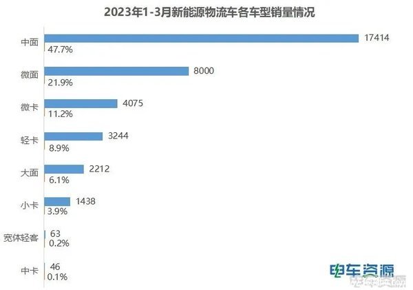 新能源微面转为新能源物流车领域第二大主力车型,累计销量为8000辆,占比21.9%,同比下滑42.6%;新能源微卡和轻卡实现同比增长,销量分别为4052辆、3244辆。