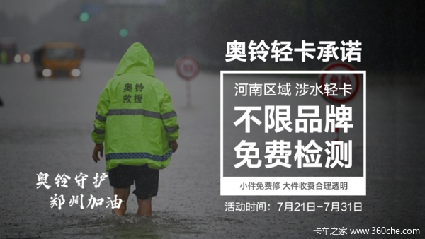 无数的车辆被洪水浸没甚至吞噬,当卡友们面对涉水车辆束手无策时,奥铃轻卡推出了河南用户专属服务政策。奥铃轻卡提出对河南涉水轻卡不限品牌免费救援、免费检测,小件免费修,大件收费合理透明的政策,最大程度降低卡友的损失。