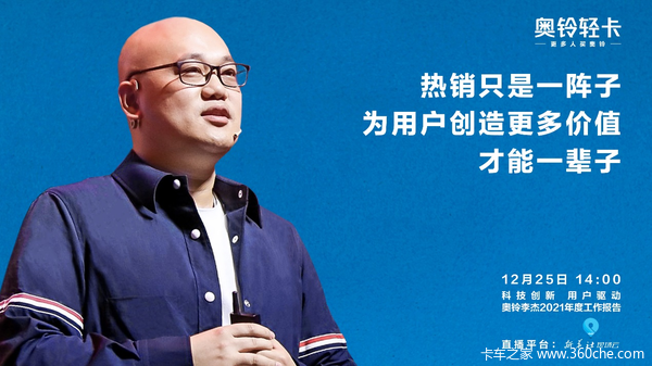 下一步,以奥铃轻卡为代表的轻卡企业,还可以从哪些领域为卡车司机创造价值?12月25日下午2点,锁定新华社现场云等直播平台,奥铃轻卡总裁李杰将面向全网分享2021年度工作报告,期待与广大经销商、合作伙伴、车企友商和媒体一起探讨。