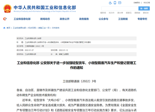 2022年1月12日,工业和信息化部联合公安部发布了《关于进一步加强轻型货车、小微型载客汽车生产和登记管理工作的通知》(以下简称“蓝牌新规”)。通知对轻型货车的技术参数做了明确要求,例如发动机排量不大于2.5L、轮胎名义断面宽度不超过7.00in(英制)、货厢内部宽度不大于2100mm等,并对车辆公告、上牌、生产、监督等环节加大约束力度,力求从产品源头有效消除轻型货车“大吨小标”、超载运输隐患。