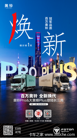 百万奥铃,全新换代。期待奥铃Pro和大黄蜂Plus登陆上海,以高效的运输能力,为这座城市和奔波在路上的卡车人带来更美好的生活。长江奔腾,江海激荡。奥铃此次抵沪,或将与共饮一江水的长三角一起,挺立潮头,向着星辰大海进发。
