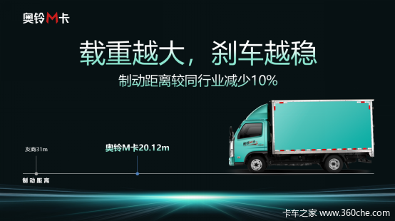 在主动安全方面,奥铃M卡采用了多项主被动安全技术,如威伯科进口的ABS防抱死系统、制动间隙自调装置、非贯通式转向器、断气刹等四大主动设计,进一步提高了整车的安全性能。多项制动安全的组合拳让M卡的制动距离较同行业减少了10%,达到了20.12m。此外,奥铃M卡还安装了和乘用车一样的智能报警系统,车门没有锁紧时,会有报警提示,从细节上杜绝安全隐患。